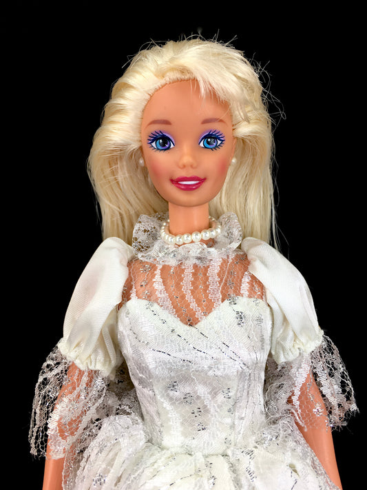 Vintage 1976 Blonde Hair Blue Eyes Barbie Doll White Lace Satin Dress with Silver Shimmer Accents